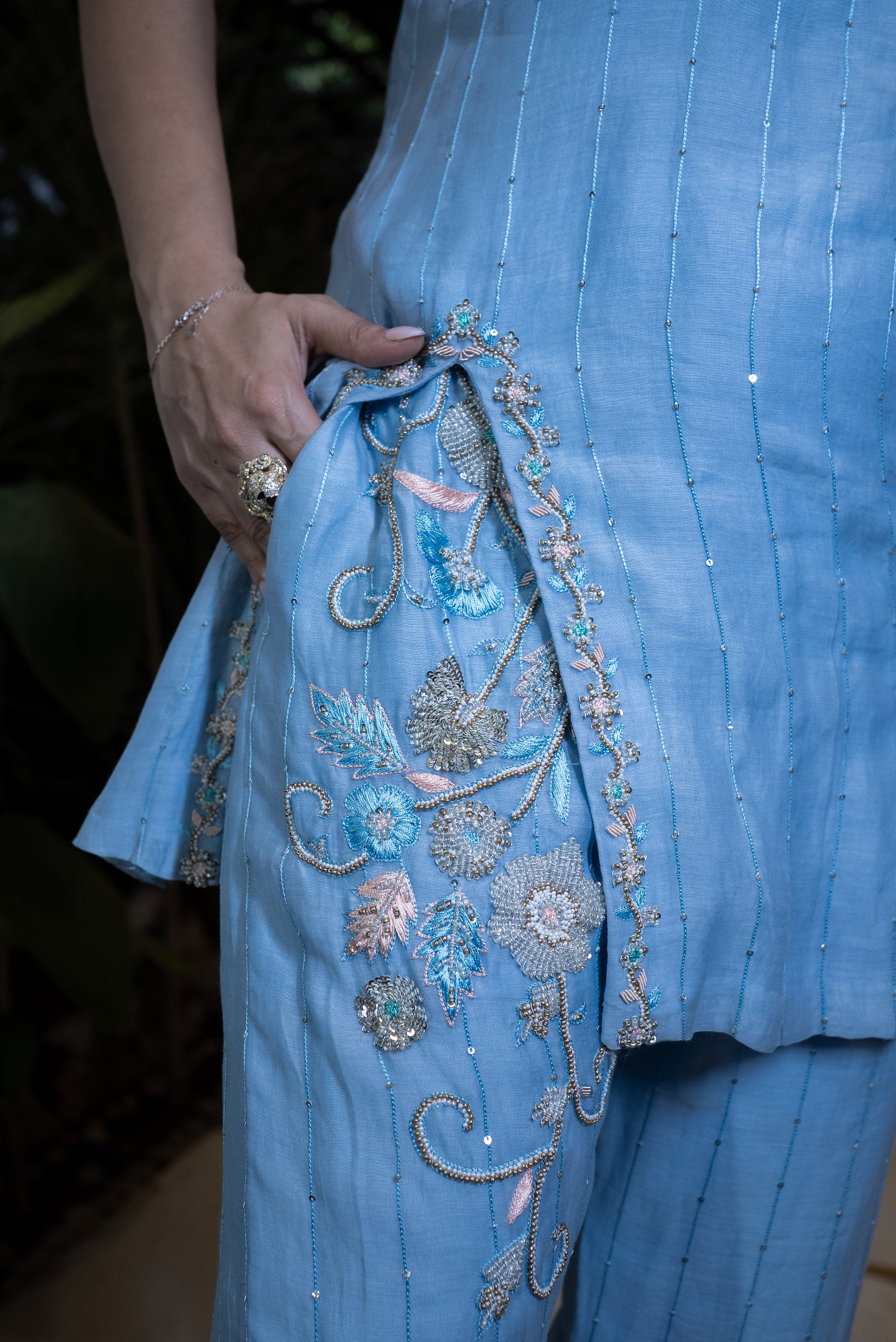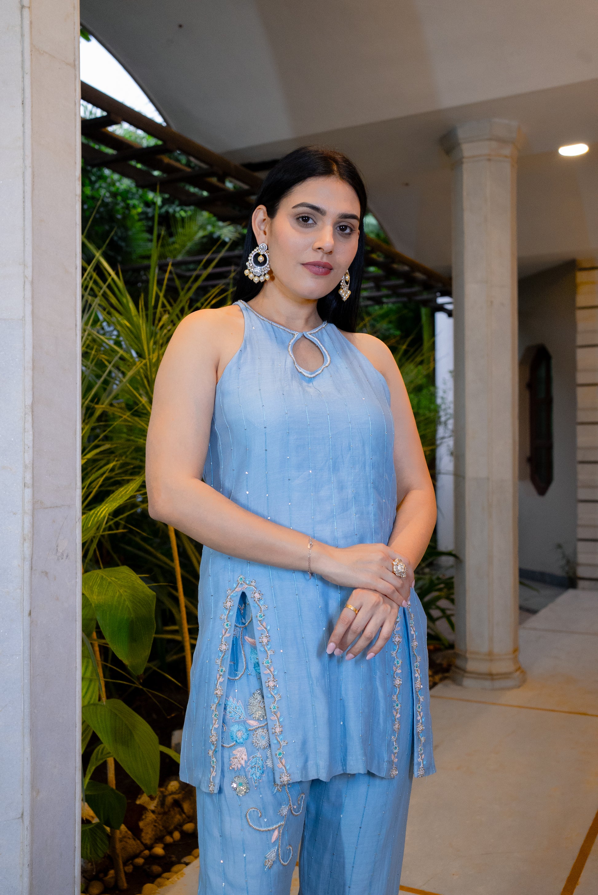 Featuring a silk Chanderi blue kurta with matching pants, embroidered details, and small side slits on both sides for added style and comfort.