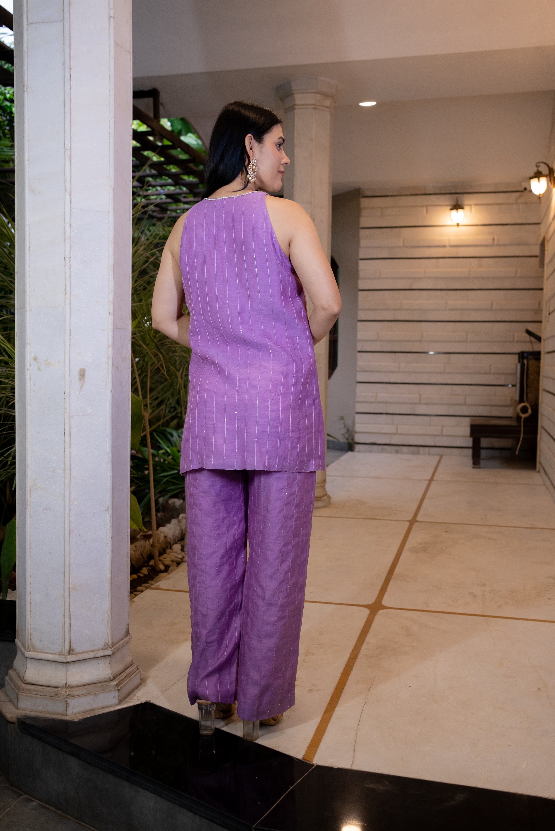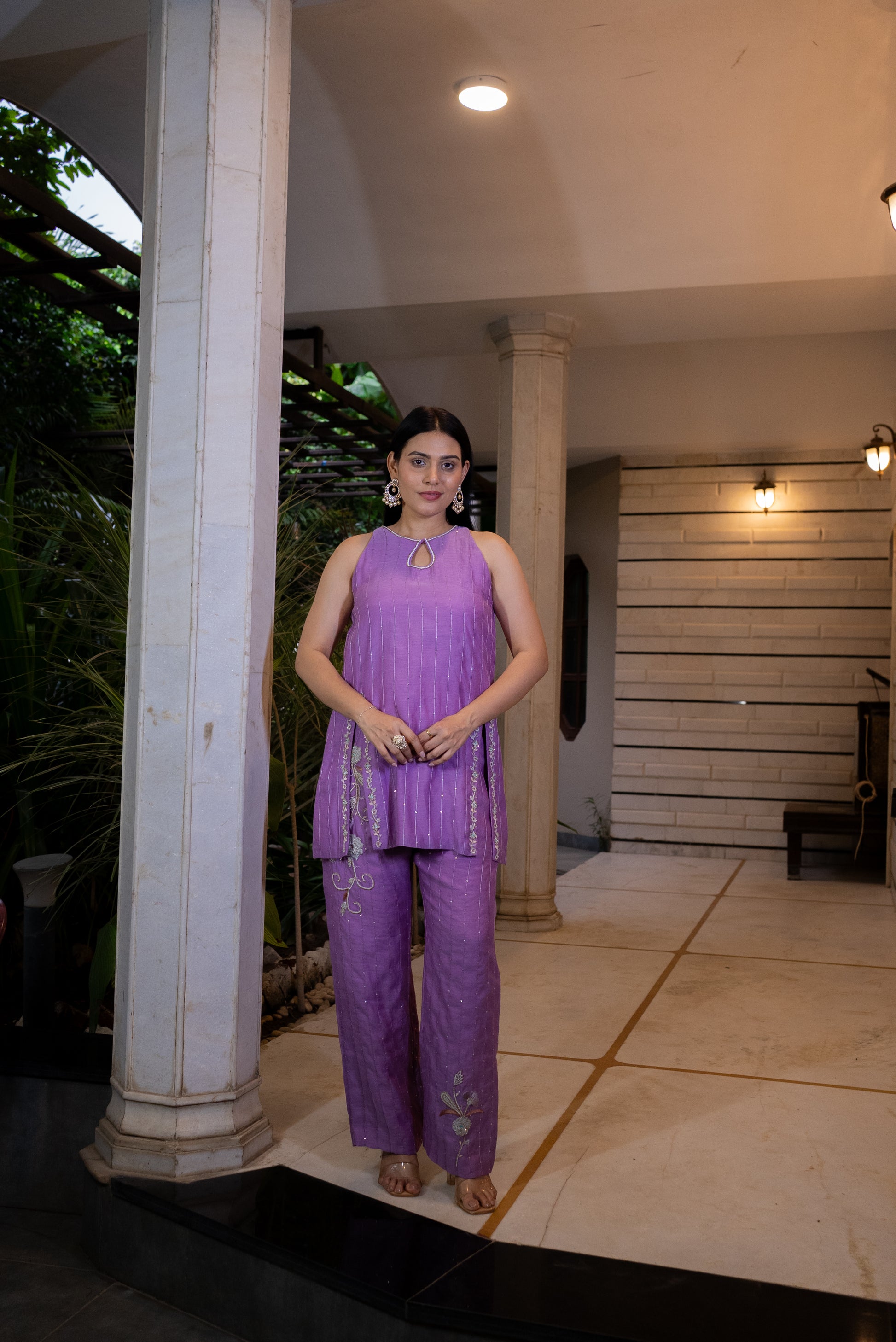 Featuring a silk Chanderi lavender kurta with matching pants, embroidered details, and small side slits on both sides for added style and comfort.