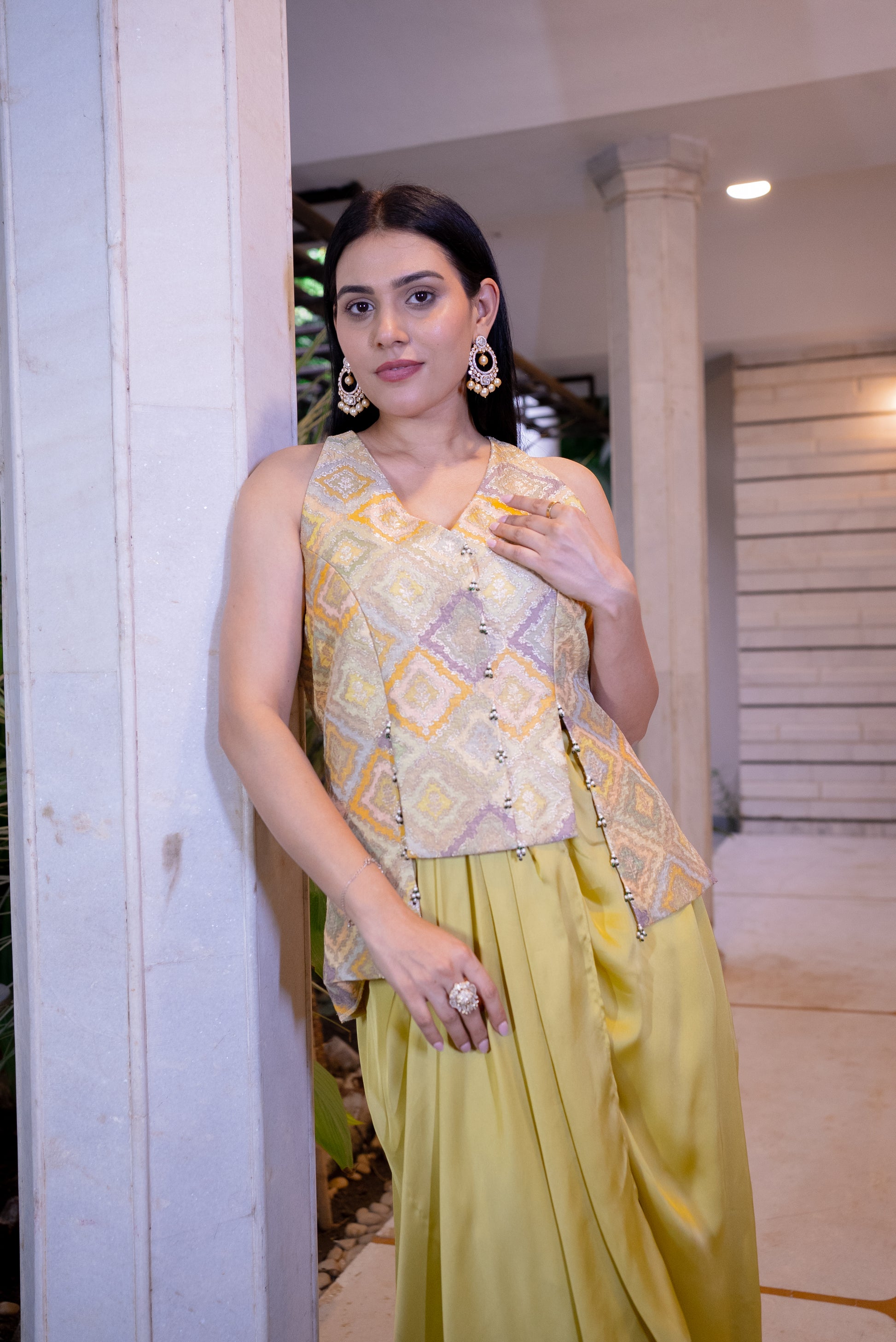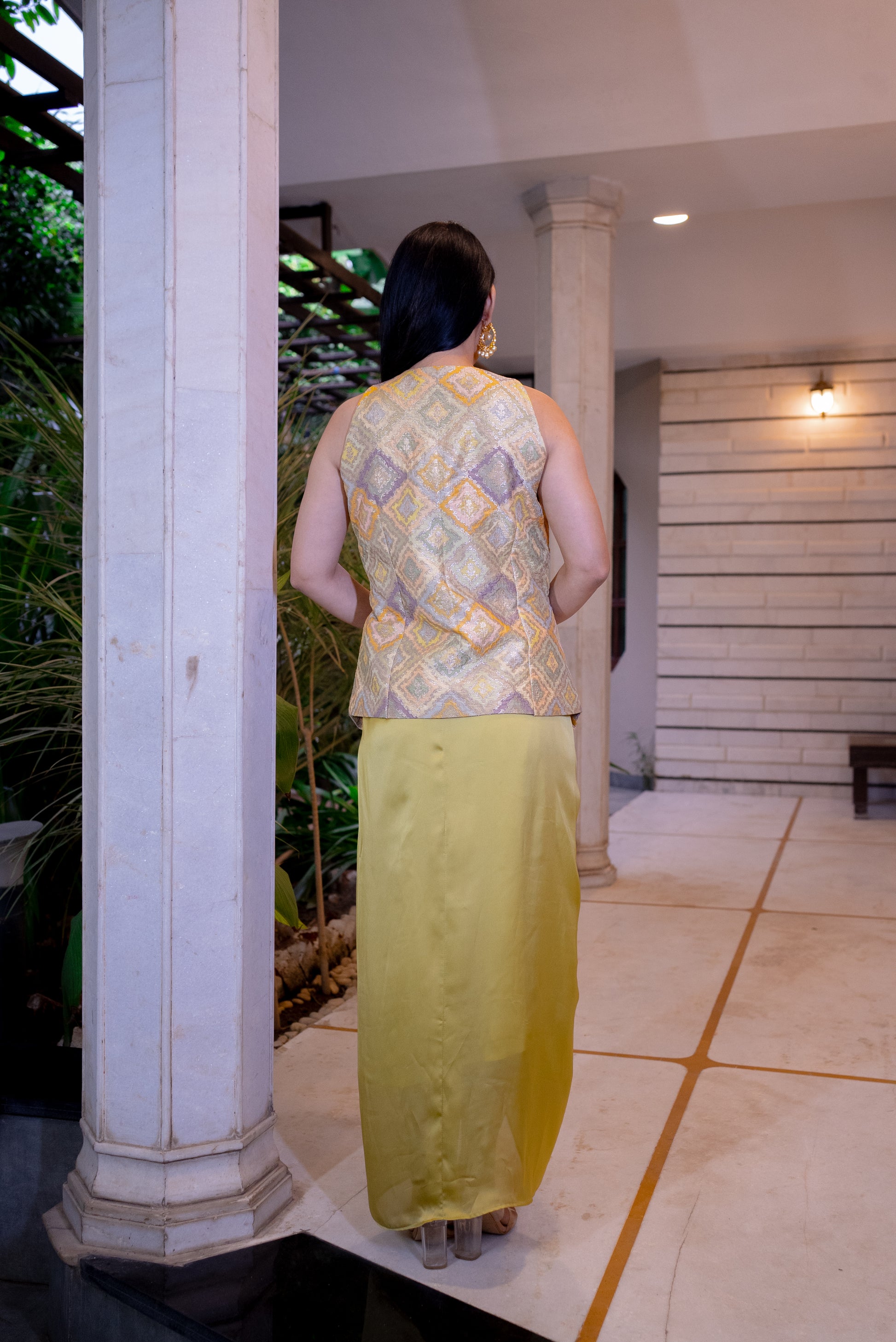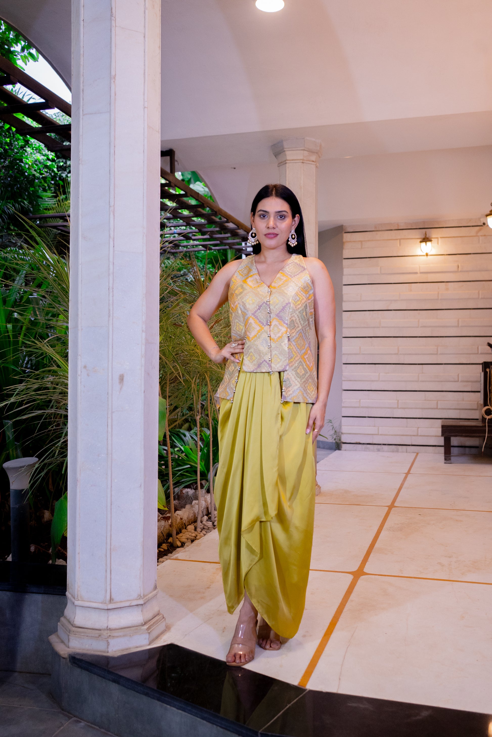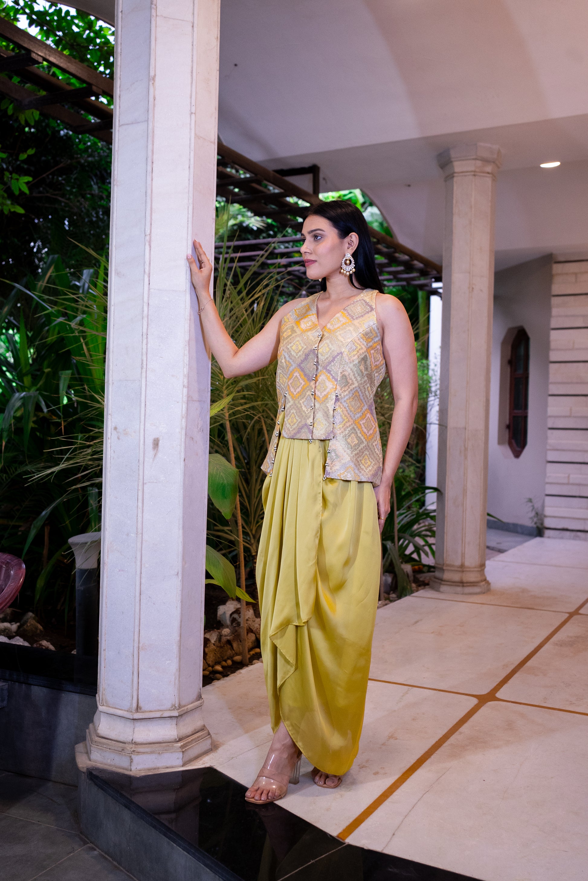 Featuring a lime green brocade satin drape skirt paired with a matching vest coat, this traditional ensemble blends vibrant color with rich textures for a fresh, elegant look.