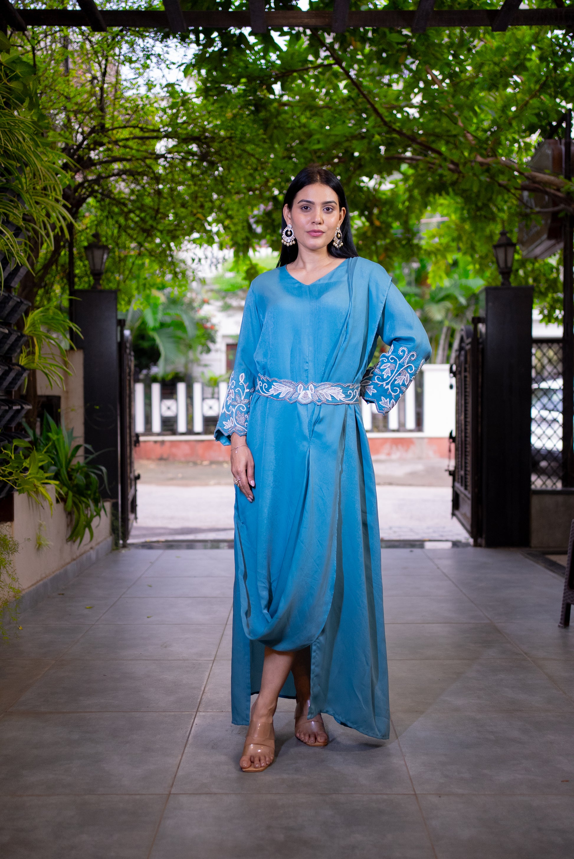 Featuring a blue drape dress with intricate embroidery, crafted from premium imported fabric for a refined and elegant look.