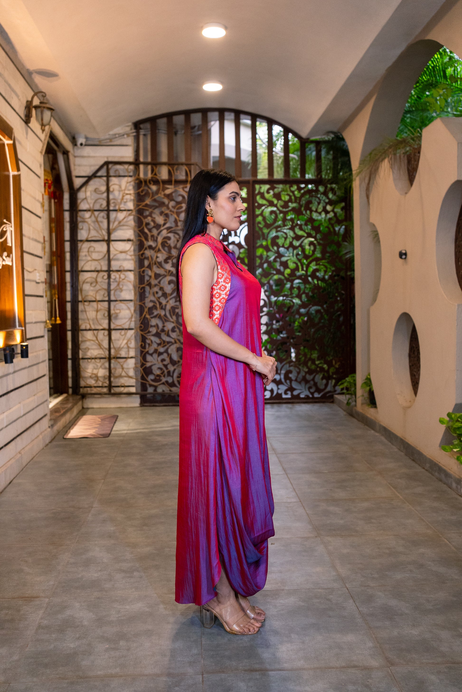 Featuring a beautifully embroidered dual-shade drape dress in harmonious purple and pink hues, combining elegance with a graceful flow.